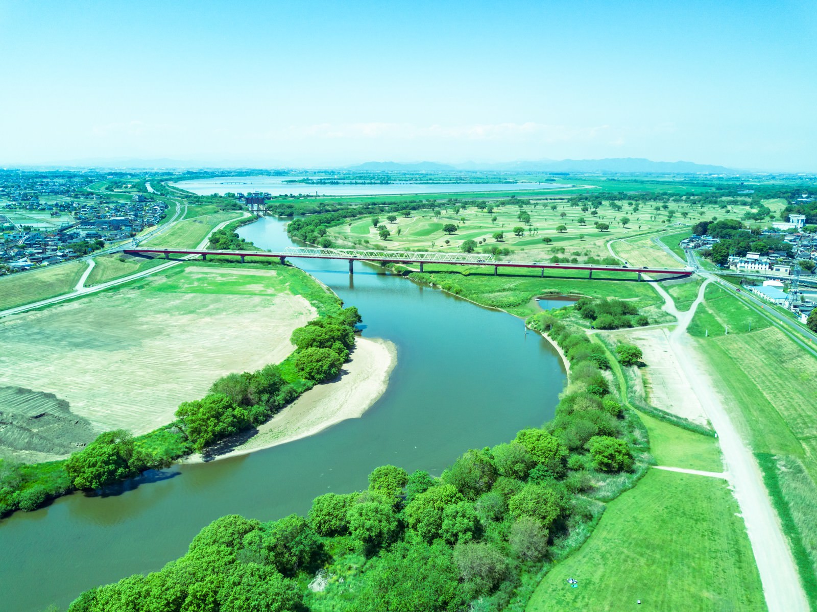 渡良瀬川と渡良瀬遊水地が見える 空撮 の写真素材 ぱくたそ